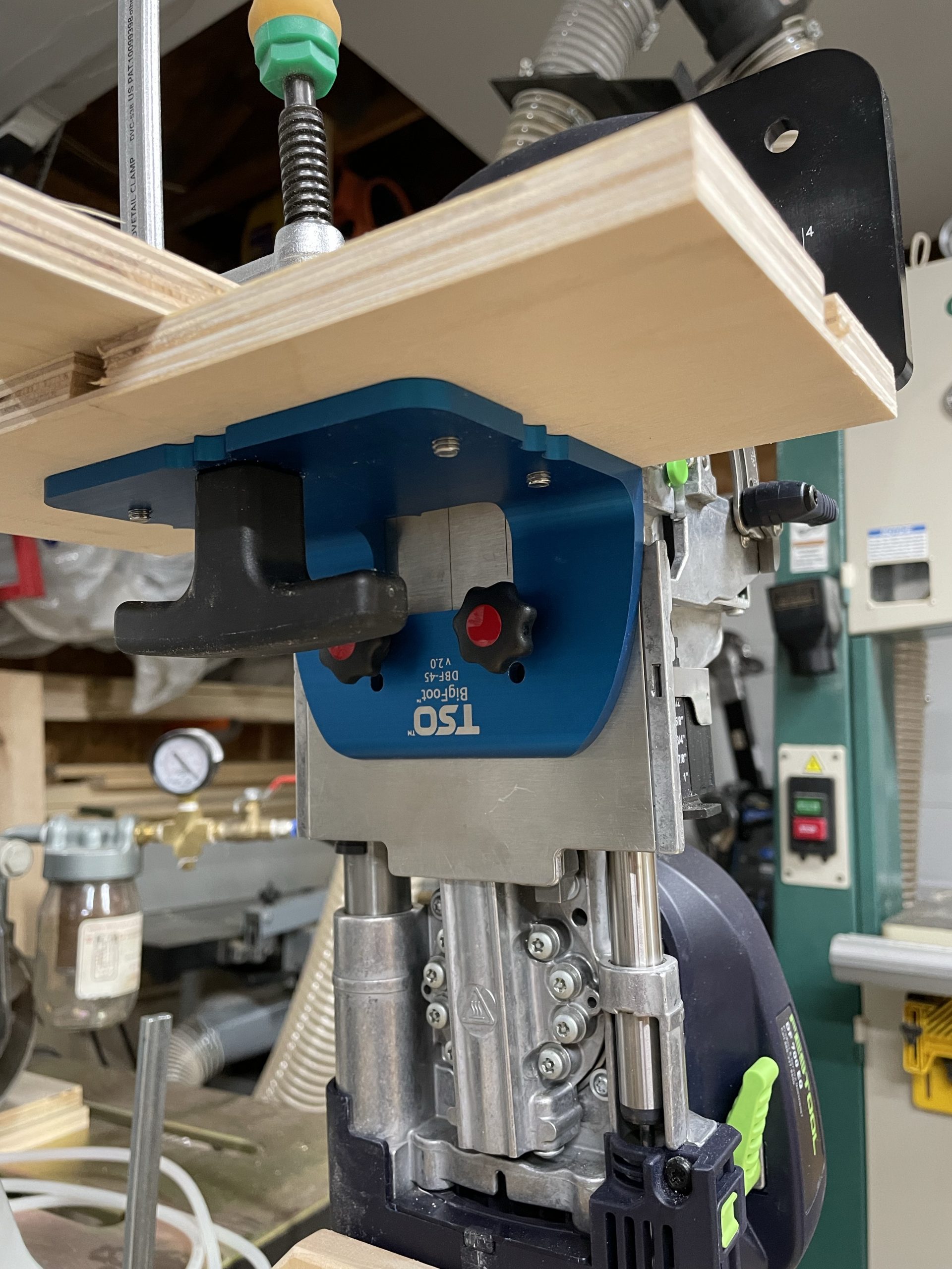 Next I use the TSO Bigfoot. The blue piece. It lets you put a 1/2” plywood base which I’ve routed dovetail slots so Microjig clamps cam be used to hold workpieces flat hands free. Now I can do mortises on the ends and then the corespondent faces of wood.
