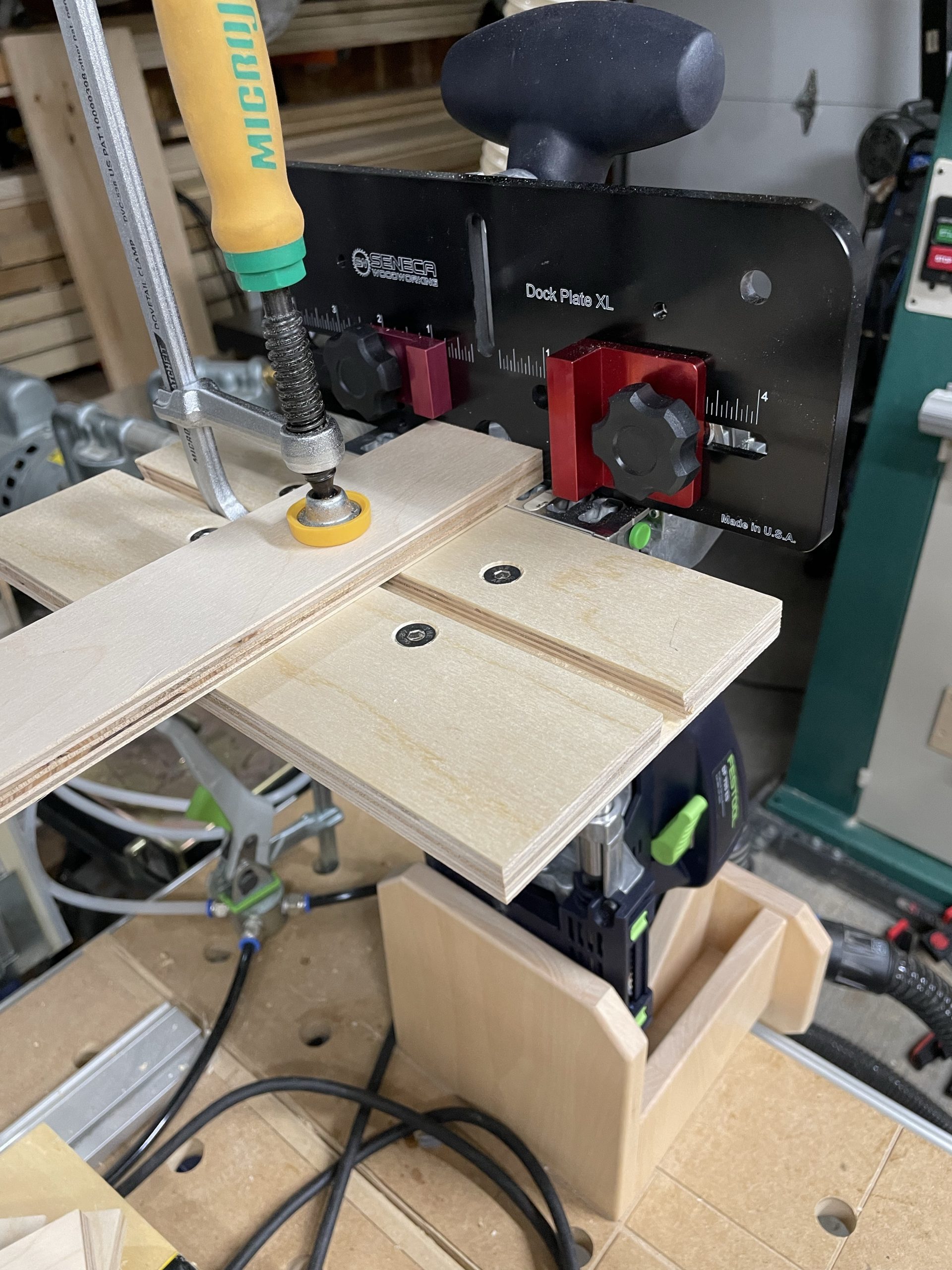 I’ve put together a good docking station to do small parts on the larger Festool Domino XL. The domino sits in a domino dock that’s clamped on the workbench so it can stand up vertically so I can bring the wood to the machine.
